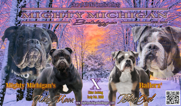 Mighty Michigan Bulldogges is excited to announce an upcoming litter expected in early February 2026 from the pairing of Mighty Michigan’s Niko Moon x Ballerz’ Opal — Embark Health Tested Included.