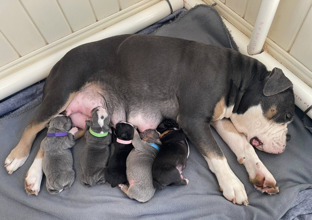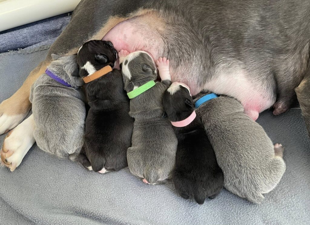 We are happy to announce our Ballerz’ Opal x Mighty Michigan’s Niko litter arrived on 2-5-26. She easily delivered five beautiful babies in just a few hours. Everyone is doing wonderfully!! She’s an amazing momma, and these puppies have some huge appetites.